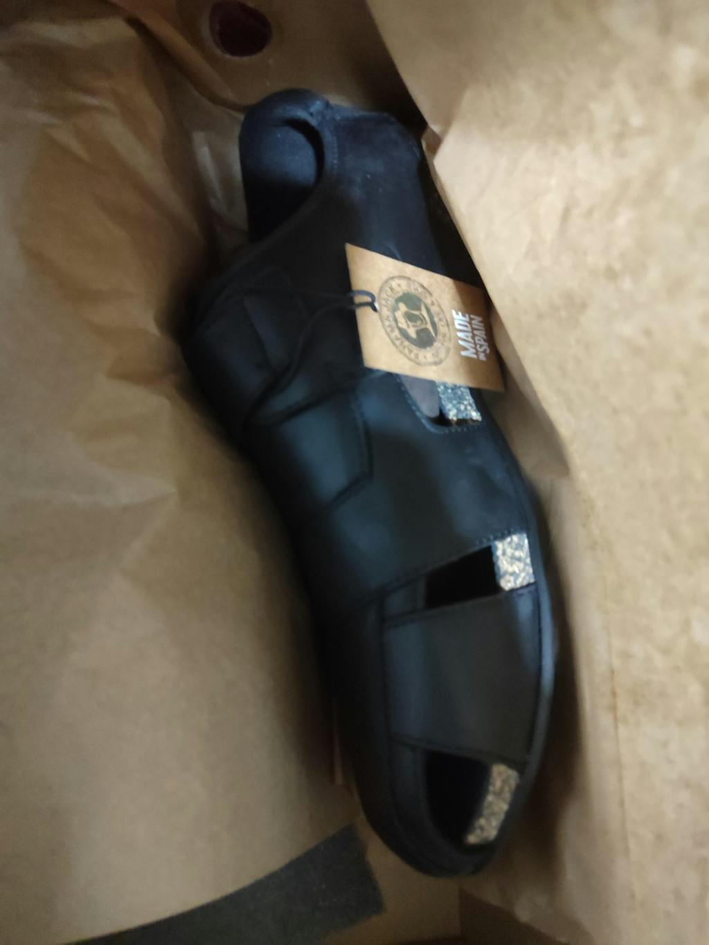 Halfopen men's shoes. Black nappa grass leather. Velcro Closure. Leather lining. Anatomical insole. Flexible and durable cork and TR rubber sole. Heel height: 3 cm. 100% Made in Spain.