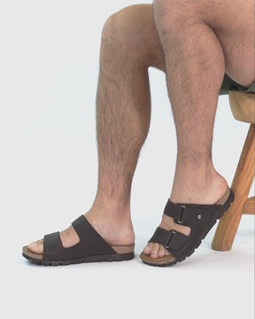 Men's sandals. WATERPROOF Brown nappa grass leather. Velcro Closure. Leather lining. Anatomical insole. Flexible and durable cork and Polyurethane sole. Heel height: 3 cm. 100% Made in Spain.
