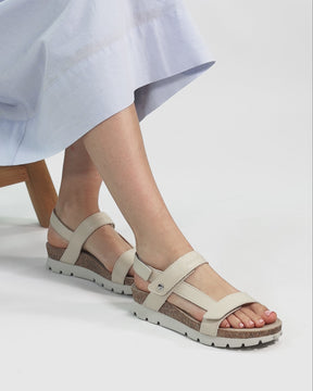 Flache Damensandale. Nappaleder in Natural. Klettverschluss. Lederinnenfutter. Anatomisch Innensohle. Leichte, flexible und robuste Sohle aus Kork und EVA. Absatzhöhe: 4.5 cm. 100% Hergestellt in Spanien.