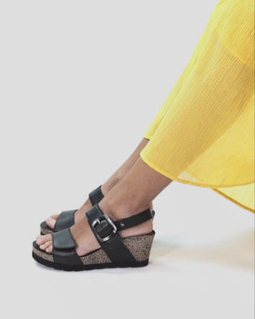 Keilsandalette. WATERPROOF Nappaleder in Schwarz. Klettverschluss. Lederinnenfutter. Anatomisch Innensohle. Leichte, flexible und robuste Sohle aus Kork und EVA. Absatzhöhe: 6.5 cm. 100% Hergestellt in Spanien.